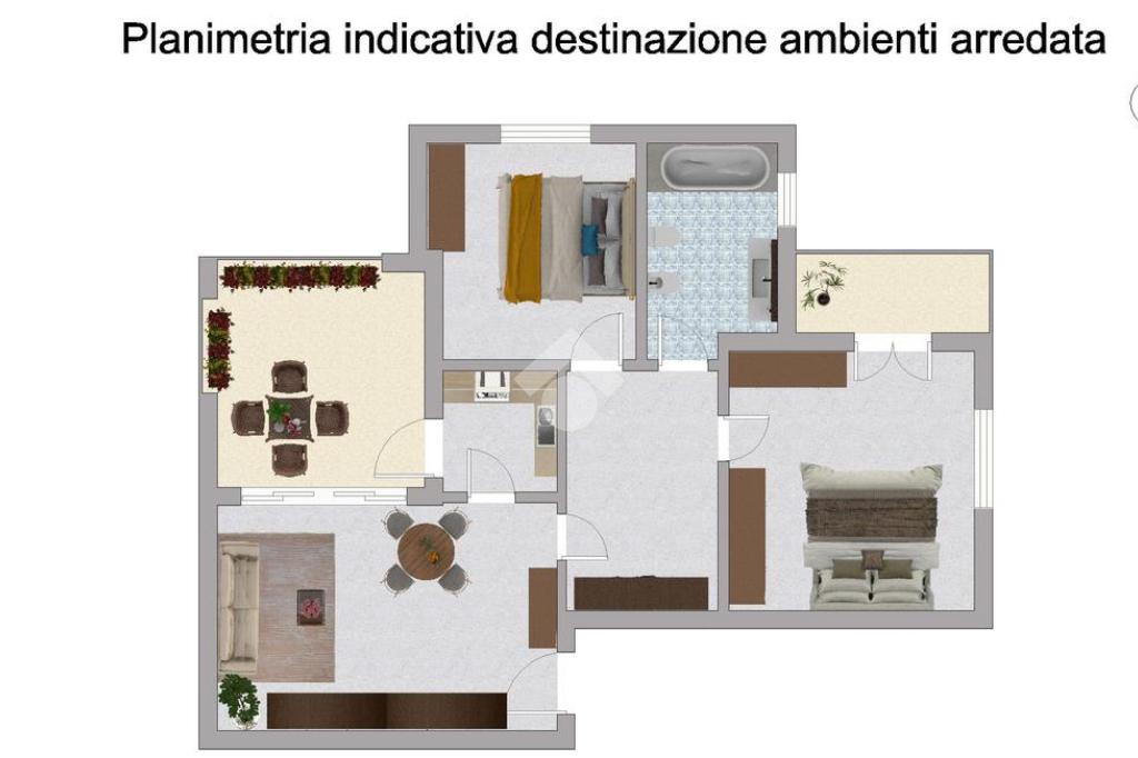 Un disimpegno separa la zona giorno dalla zona notte, composta da cameretta, camera matrimoniale e bagno finestrato con vasca.